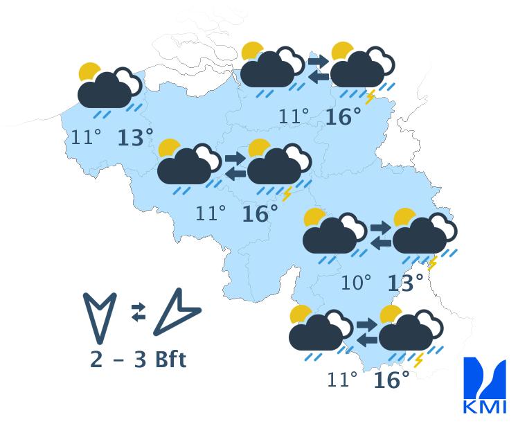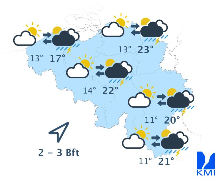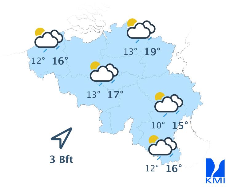 Morgenvroeg is het gedeeltelijk bewolkt. In het centrum en noorden en nadien ook elders worden de opklaringen geleidelijk aan breder. In de loop van de namiddag wordt het uiteindelijk zonnig. Het wordt vrij warm met maxima tussen 15 graden aan zee en 22 graden in Belgisch Lotharingen. De wind is goed voelbaar. Er staat een matige of aan zee vrij krachtige wind uit het oosten tot noordoosten, met rukwinden tot 50 km/u of aan zee wat meer.