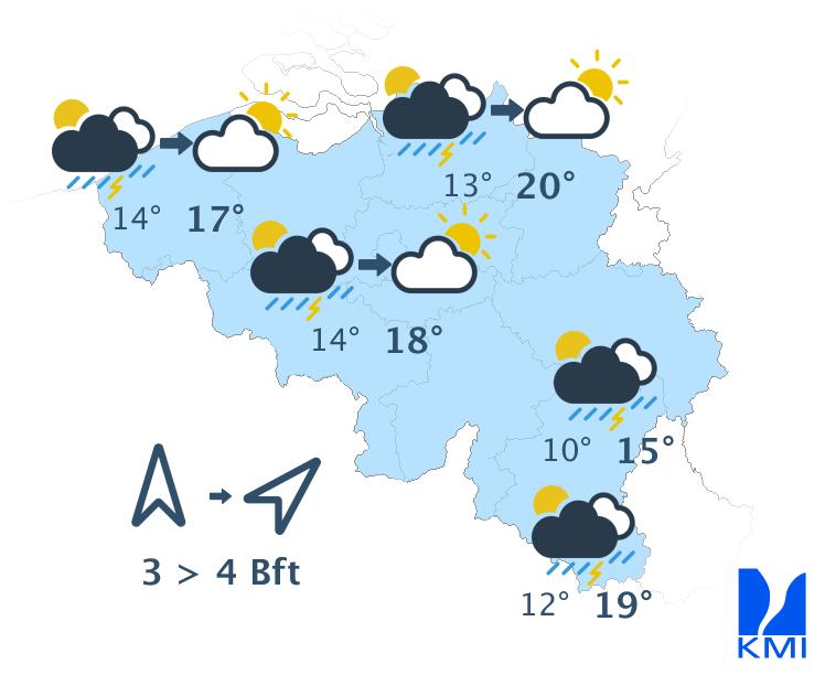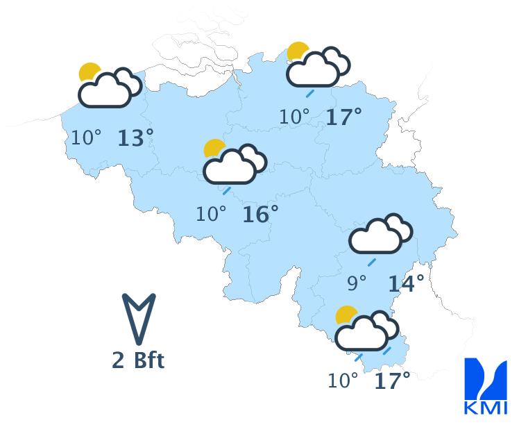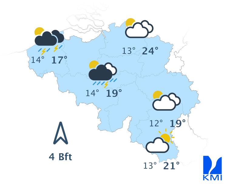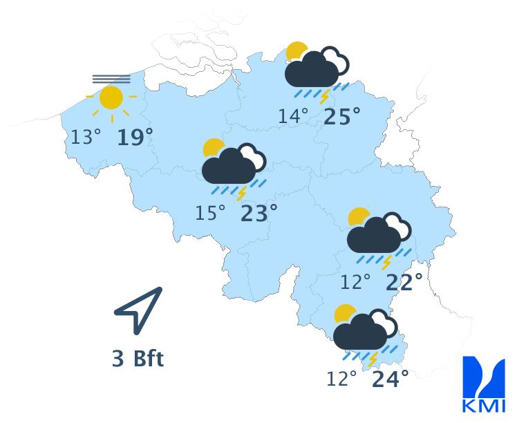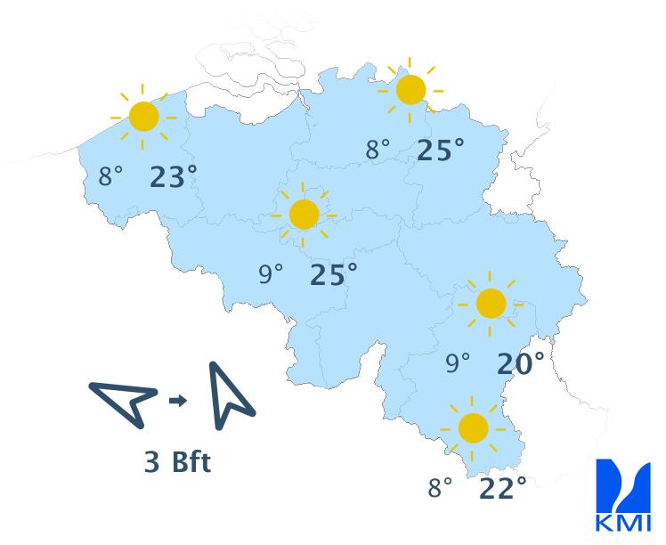Vrijdag is het opnieuw een groot deel van de dag zonnig. 's Avonds wordt het geleidelijk wisselend bewolkt met kans op een bui of mogelijk een onweer in het westen van het land en langs de Franse grens. De maxima schommelen tussen 19 graden in de Ardennen, 23 graden aan zee en 24 of 25 graden in het centrum van het land. De wind waait meestal matig uit zuidoost.