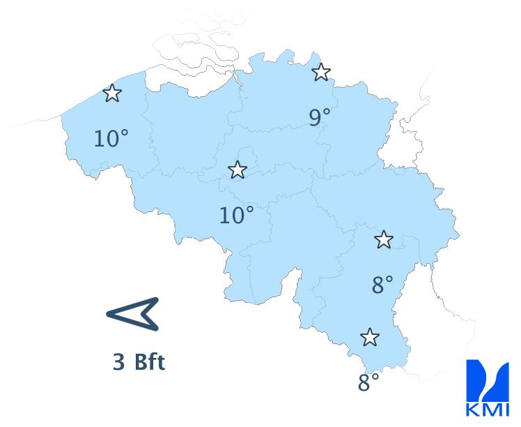 Vannacht komt er weinig verandering. Het blijft helder met minima tussen 4 graden op de Ardense hoogten en 10 graden in Vlaanderen bij een matige oostenwind.