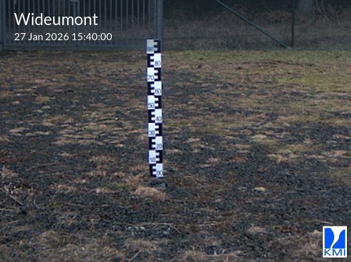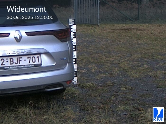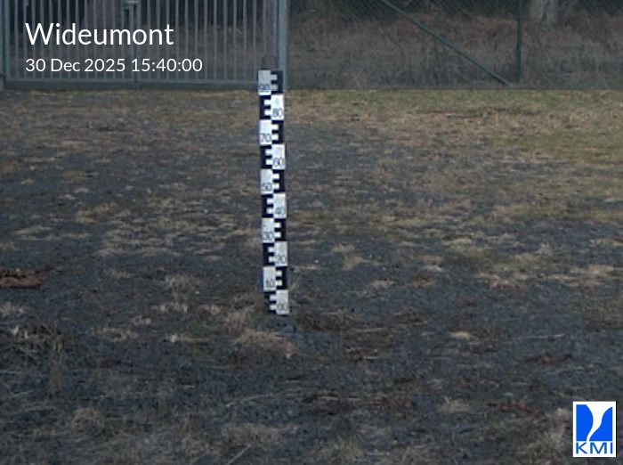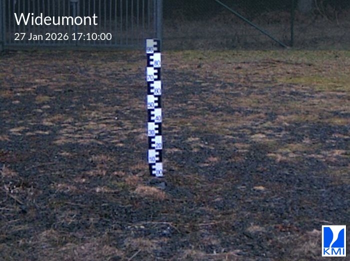 De meetlat op het beeld laat toe om de actuele sneeuwhoogte (in cm) in te schatten.
